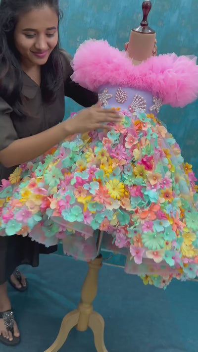 The Multi Colour Floral High Low Gown with Pink Ruffle Top is a dreamy fusion of oceanic charm and blooming elegance. Designed in soft pastel shades, it features delicate 3D floral appliqués paired with shimmering shell and star embellishments that evoke seaside magic. The layered ruffled neckline and voluminous skirt create a graceful, fairy-tale silhouette — perfect for birthdays, parties, and grand celebrations.