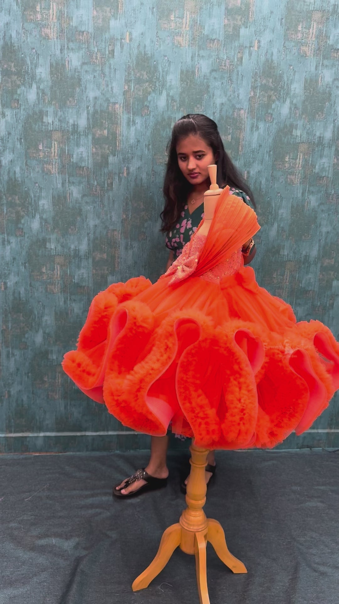 Ignite the spotlight with this breath-taking gown, a masterpiece of glowing . The sparkling orange uneven embossing ruffle dreamy ball gown and voluminous layers dance like flames under soft light, capturing the spirit of confidence and elegance. A true couture creation for the little star who was born to shine.