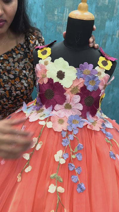 The Peach Fairy Garden Floral Ball gown radiates beauty, grace, and craftsmanship. Featuring a vibrant bodice adorned with delicate 3D floral appliqués and a voluminous coral tulle skirt, it captures the essence of a blooming sunrise. Designed to make every little princess shine, this gown is a masterpiece of colour, texture, and couture elegance.