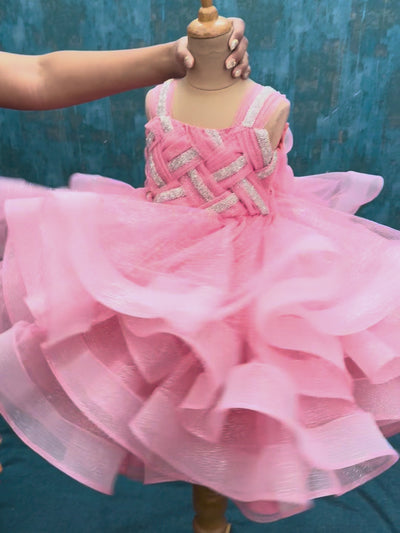 Delicate and enchanting, the Peach Glittery Ball Gown with Silver Draped Top is designed to capture the grace of a blooming flower. The intricately woven criss-cross bodice shimmers with silver accents, while layers of soft pink ruffles cascade gracefully, sparkling with a subtle glitter finish. Light, playful, and full of charm, this dress is a perfect blend of elegance and whimsy—made for moments as magical as a garden in full bloom.