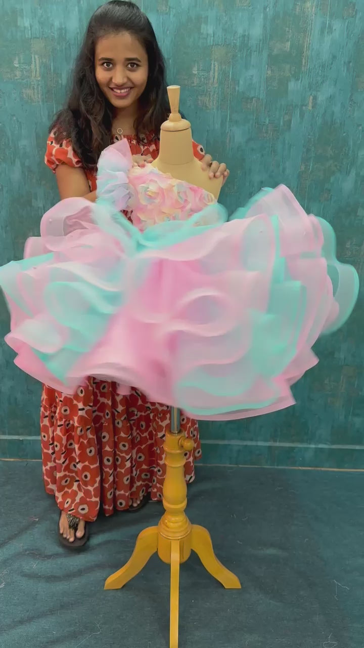 Pink and turquoise floral Ruffle Gown With One Side Shoulder — A whimsical creation straight from a fairy dream. Designed in delicate shades of pastel pink and aqua, this gown features a one-shoulder floral bodice adorned with soft rosettes that bloom with charm. The voluminous layered ruffles swirl like cotton candy clouds, adding bounce and magic to every twirl. Perfect for little fashion moments, this gown captures the sweetness of childhood with a boutique touch of elegance and playfulness.