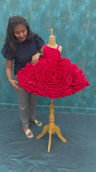 The RED EMBOSSED RAW SILK FLORAL KNEE LENGTH GOWN is a breathtaking statement piece crafted in rich crimson fabric. Its voluminous skirt features layers of meticulously hand-ruffled petals, creating a stunning rose-bloom effect. The sleek one-shoulder bodice adds a modern touch, making it a perfect blend of elegance, drama, and couture charm for any grand occasion.