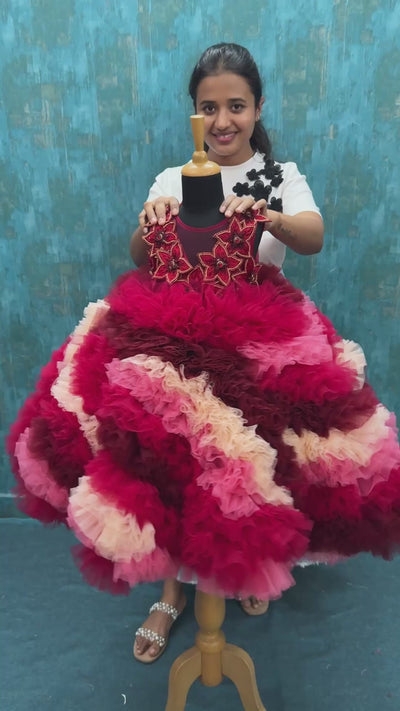 A mesmerizing creation that blooms with passion and grace, the Red Velvet Petal Ruffle Ball Gown captures the essence of luxury and playfulness. The dress features cascading layers of soft tulle in rich shades of crimson, rose, and blush, forming a voluminous petal-like silhouette that dances with every movement. The bodice is adorned with intricate floral hand appliqué work and beadwork, adding a regal sparkle that complements the dramatic skirt. Perfect for grand celebrations and unforgettable moments, this couture masterpiece embodies elegance, energy, and enchantment all in one twirl.