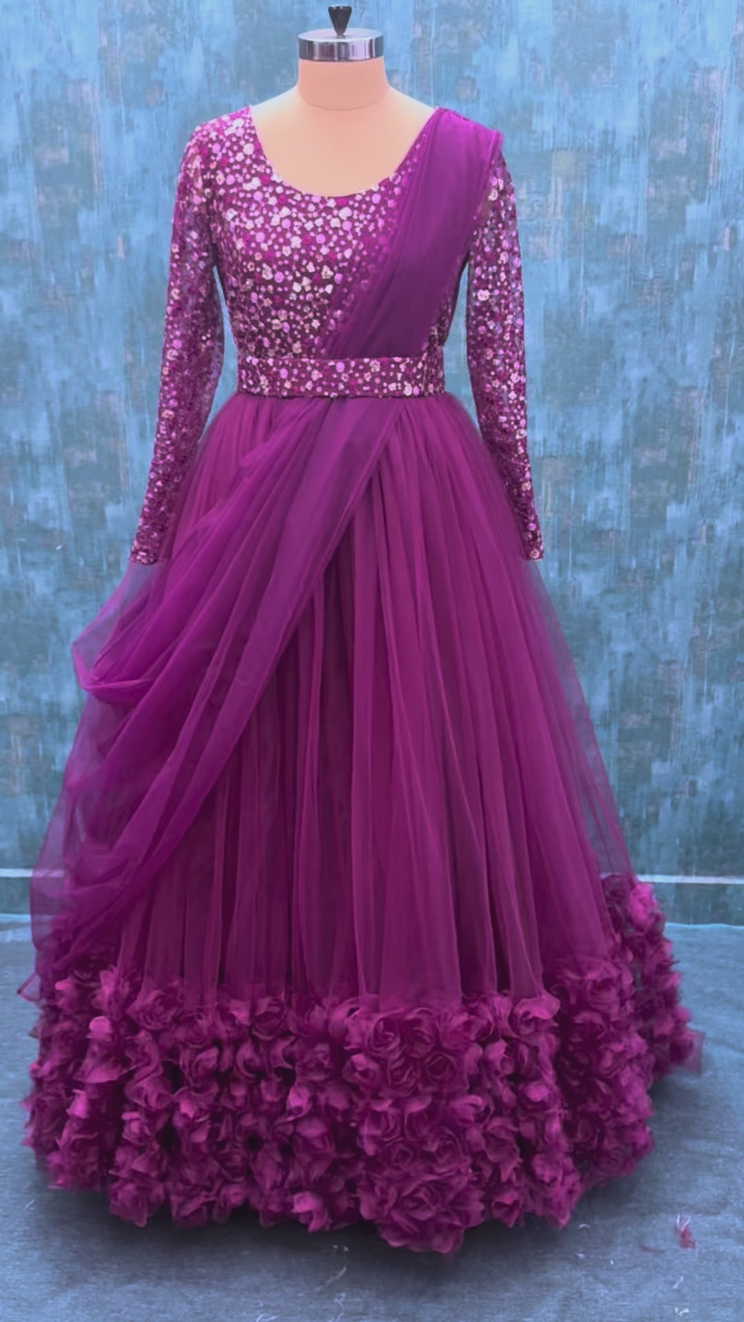 The Roseberry Regal Grace Gown is a rich blend of elegance, charm, and timeless luxury. Designed in a deep roseberry hue, this gown features a sparkling sequin-embroidered bodice that glimmers like precious jewels with every movement. The long sheer sleeves add refined sophistication, while the flowing layered tulle skirt creates a dreamy, princess-like silhouette.