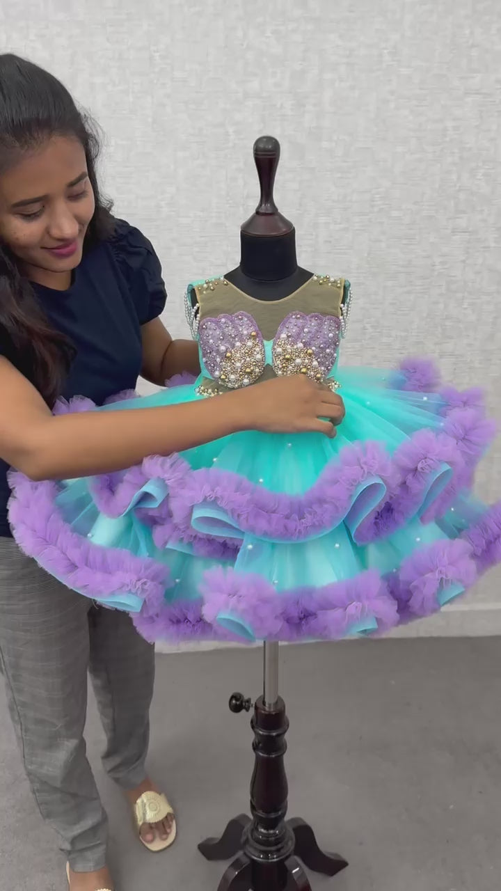 The Turquoise And Lavender Mermaid Gown With Ruffle Layers is a stunning ocean-inspired masterpiece featuring a seashell-embellished bodice adorned with pearls and crystals. The turquoise tulle skirt flows in voluminous layers edged with soft lavender ruffles, creating a dreamy undersea effect. Perfect for special occasions, this gown captures the elegance and sparkle of a true mermaid princess.